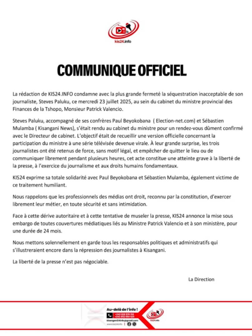 Trois journalistes locaux, Steves Paluku (kis24.info), Paul Beyokomana (election-net.com) et Sébastien Mulamba (KisanganiNews), sont actuellement…