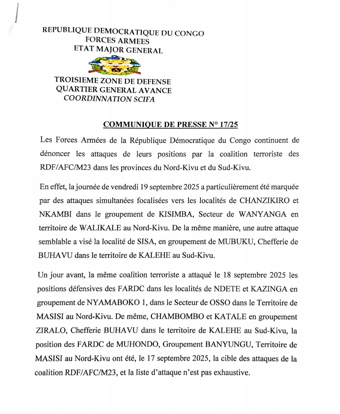 Est de la RDC : face aux violations répétées du cessez-le-feu par RDF/AFC-M23, les FARDC menacent de riposter vigoureusement