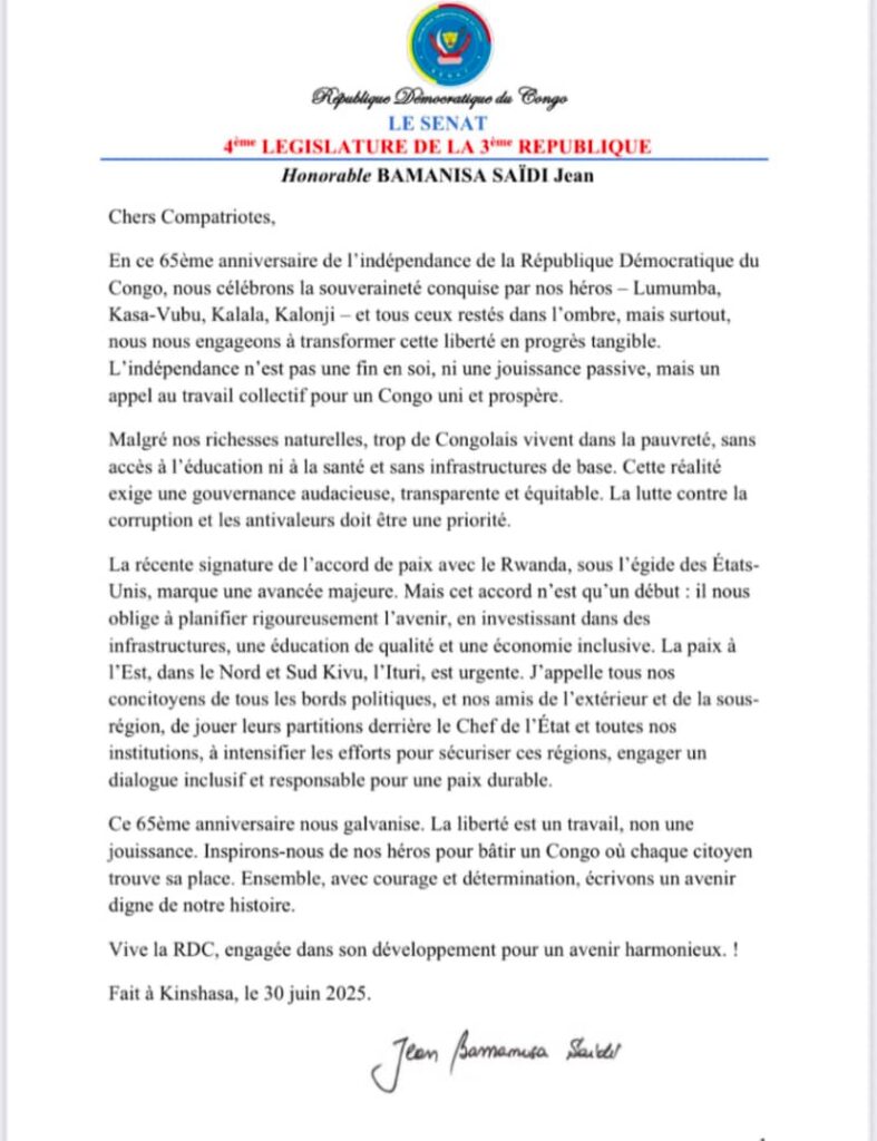 En ce jour symbolique du 65ème anniversaire de l’indépendance de la République Démocratique du Congo (RDC), le sénateur Jean Bamanisa Saidi a lancé un message poignant soulignant la nécessité de transformer la liberté acquise en progrès concret pour tous les Congolais. Rendant hommage aux figures emblématiques de la lutte pour l’indépendance, telles que Patrice Lumumba, Joseph Kasa-Vubu, et d’autres héros restés dans l’ombre, le sénateur Bamanisa a appelé à une mobilisation collective pour poursuivre le travail entamé par ces pionniers.