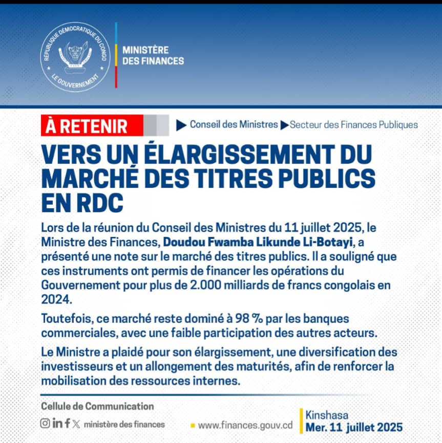 Les titres publics, bons et obligations du Trésor sont devenus en peu de temps un pilier de la politique budgétaire de la RDC. Ils permettent au gouvernement de financer ses priorités tout en impliquant directement les institutions financières locales dans le développement national. Pour Doudou Fwamba, ce mécanisme représente un double avantage : assainir la gestion des finances publiques tout en dynamisant le marché financier congolais.
