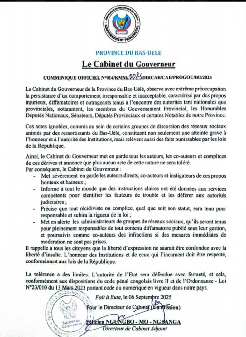 Bas-Uélé : mise en garde sévère du gouvernement provincial contre les dérives sur les réseaux sociaux