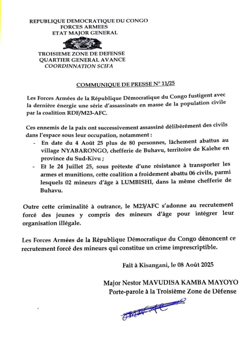 Agression rwandaise à l’Est : l’armée dénonce une vague d’assassinats de civils par la coalition RDF/M23-AFC