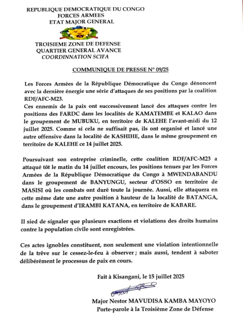 Est de la RDC : Les FARDC dénoncent une série d’attaques menées par la coalition RDF/AFC-M23