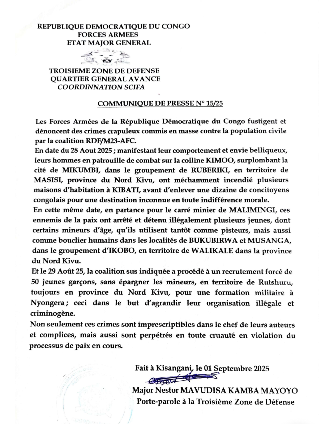 Agression dans l’Est : l’armée fustige la terreur de la coalition RDF/M23-AFC dans plusieurs localités du Nord-Kivu